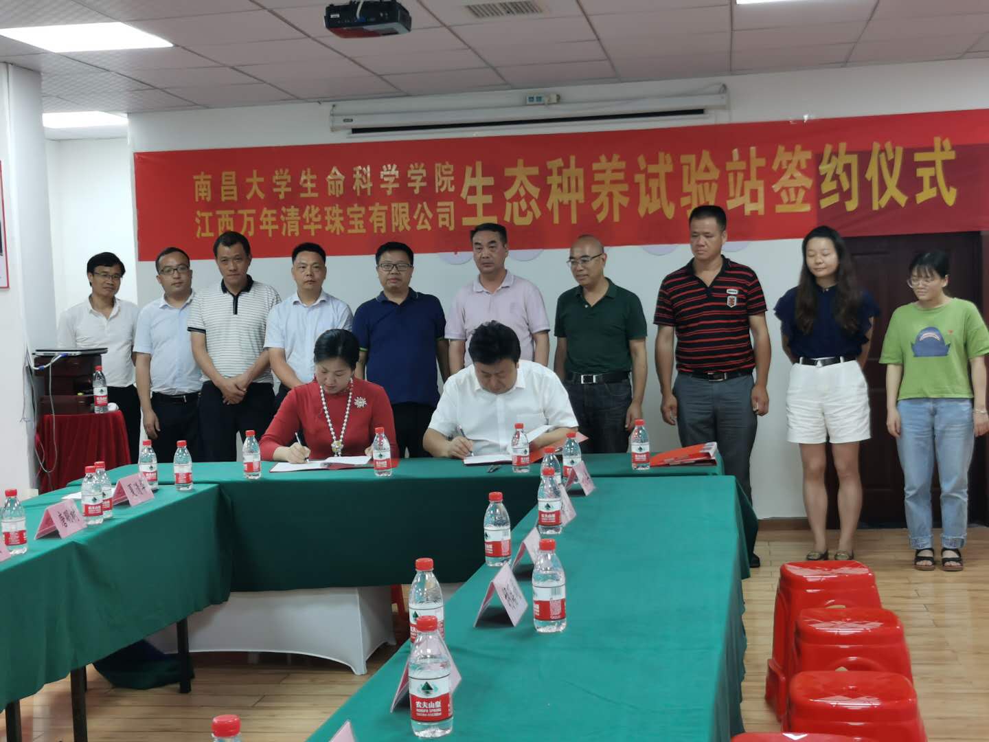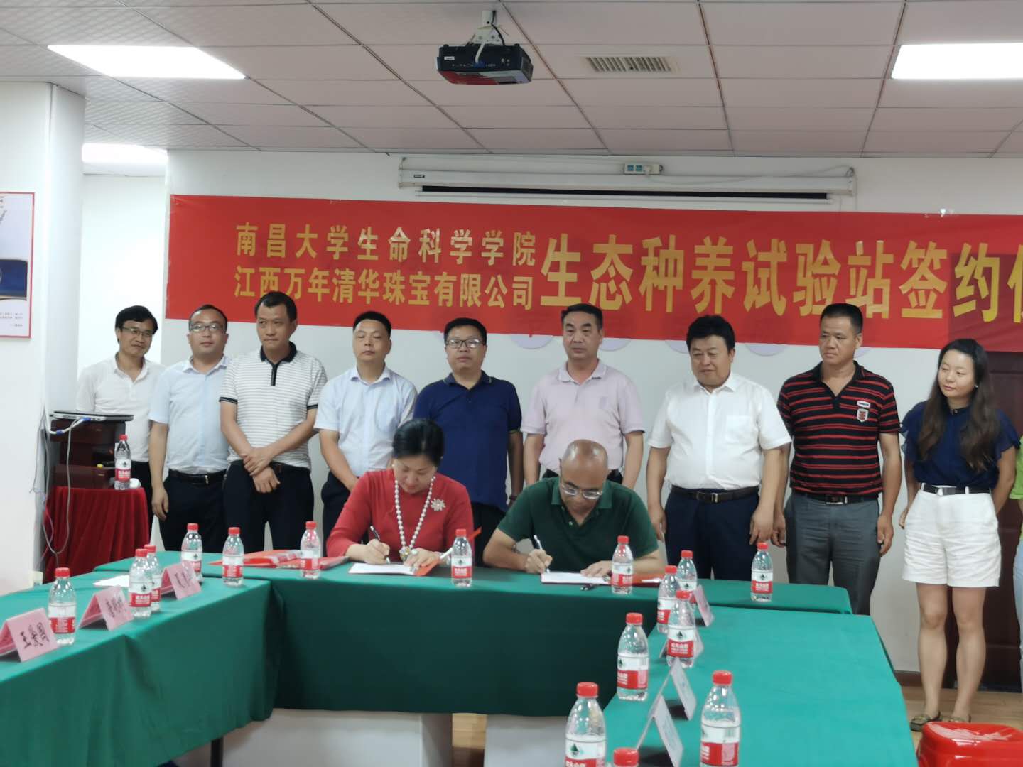 下午五点,签约挂牌仪式在夏清华珠宝有限公司二楼会议室举行。首先由夏清华珠宝有限公司董事长夏清华致欢迎辞,并对在座所有领导表示了深深感谢。接下来洪一江教授与徐毛喜书记分别就珍珠养殖一事做了科学性地深度剖析,也对签约后双方未来的共同发展前景做了客观地展望,万年县县委常委王爱国进行了总结发言。