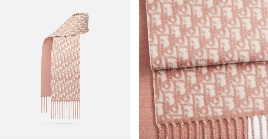 2026早春系列新品,施以Dior经典图案。100%山羊绒,玫瑰粉色底色搭配Oblique印花,双面设计(一面纯色,一面印花),手工流苏饰边,意大利制造。