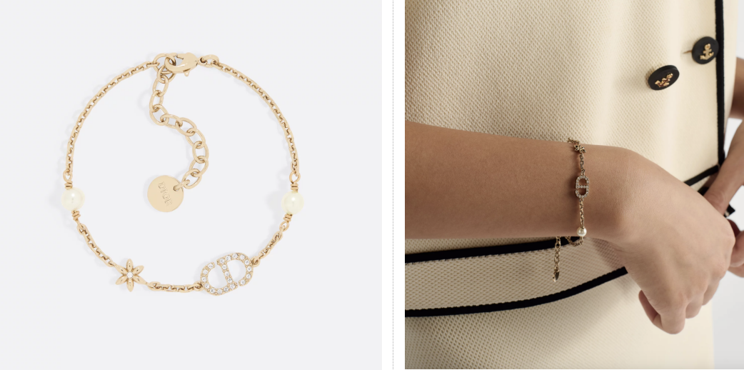 (图注:左:Petit CD Daisy手链整体展示,手链缀CD徽标与星芒珍珠,璀璨典雅,尽显精致工艺。右:手链佩戴展示,碎钻星芒与珍珠映衬,诠释叠戴艺术与精致奢华。)