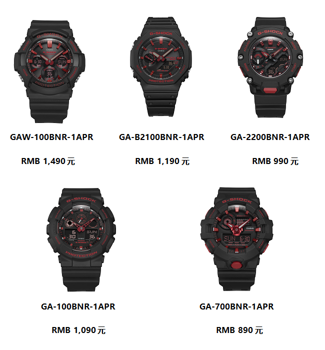 无论你是喜欢鲜明的棱角还是堆叠的层次感,G-SHOCK 「小红焱」系列的丰富表款都能满足你的个性表达!强调秩序感的GAW-100BNR-1APR以对称的三眼表盘设计呈现硬派视觉;GA-B2100BNR-1APR则将先锋态度敛入八边造型,每一段线条都是年轻的锋芒,每一处棱角都是不羁的个性,更搭载了蓝牙连接功能,可与智能手机进行连接;以六颗铆钉牢牢定格悍勇风格的GA-2200BNR-1APR未来感十足,强大的碳纤维核心防护构造更彰显出烙印在基因里的坚韧属性;GA-100BNR-1APR表盘内集合多种时间信息,读时更加便捷;还有造型粗犷的GA-700BNR-1APR,表盘指针与3D立体整点刻度呈现十足层次感,强悍逼人。