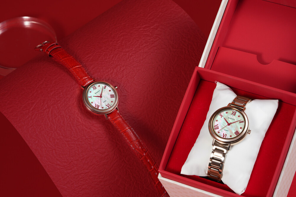描摹未来的期许,采撷时尚的跃动,“璀璨SHEEN光”SHS-4527CGL-7AUPRN的每一条曲线、每一处细节,都彰显了女性的优雅韵致。腕表采用皮质表带,以更加贴合皮肤的舒适性衬托女性柔美的腕部线条,诠释东方的细腻之美。而红色作为可以与各种肤色相搭配的颜色,以自身的生命力渲染了秋冬穿搭的意境。白色贝母流光溢彩,凝聚独特而不浮夸的复古感,在简约的设计下更显诗意。无论搭配气质温柔的毛衣,或是飒然利落的长款风衣,都更添浓情明艳。红色不仅是尊贵与希望的色彩,也寄托着明媚的祝愿,愿你新的一年,鸿运满满。