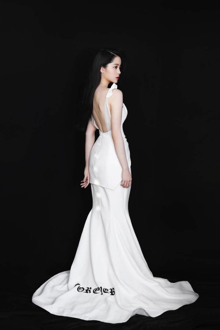 欧阳娜娜穿着VERA WANG白色鱼尾裙出席活动,罕见开深沟