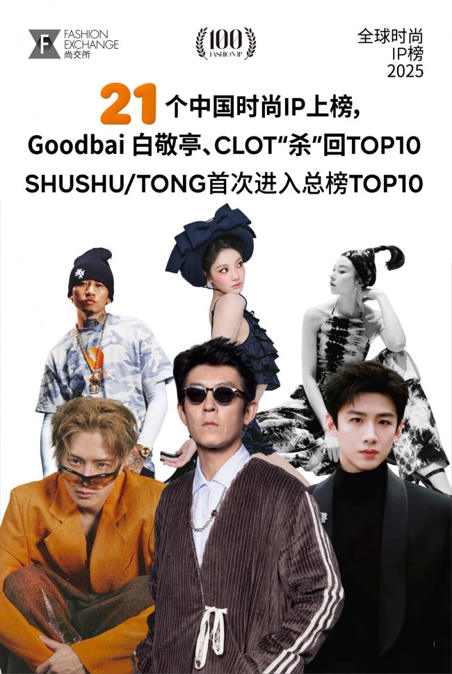 2025年,中国本土时尚IP表现实现群体性突破。共有21位中国时尚IP上榜,与美国、日本数量趋近。在总榜排名上升的47个时尚IP中,有12个来自中国,中国成为上升时尚IP最多的国家。在经历2024年本土时尚IP集体缺席TOP10后,2025年白敬亭主理品牌GoodBai、陈冠希主理品牌CLOT、设计师品牌SHUSHU/TONG强势进入总榜前十,标志着本土创意在市场顶端话语权的回归。
