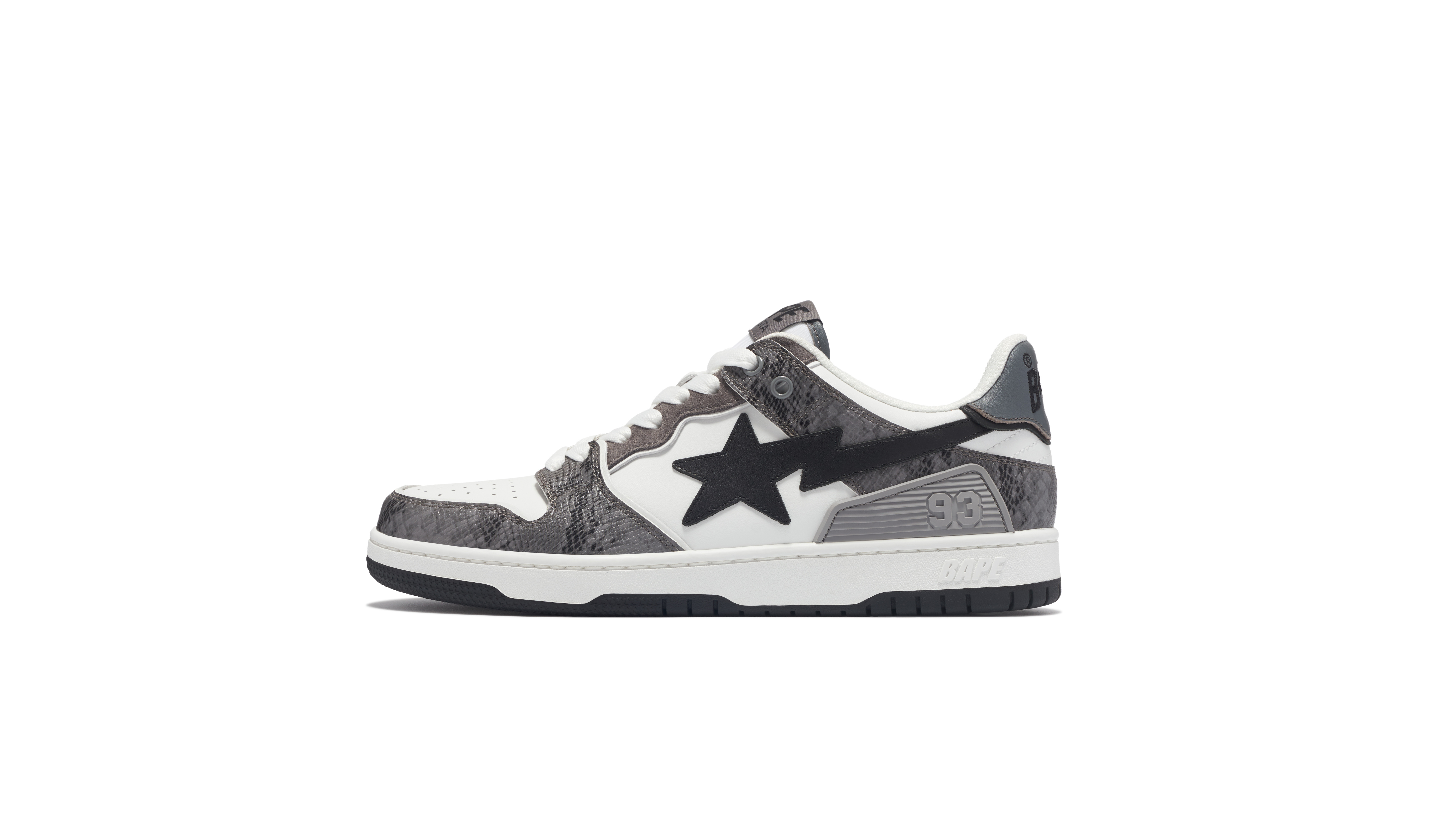 系列延续BAPE® SK8 STA经典鞋型设计,精选多种优质皮革打造,包括牛皮和麂皮等,赋予鞋款超凡耐用性和持久的精致感。鞋面以黑色和白色作为基底,搭载浅褐、深灰两款仿真蛇皮创意,形成质感与肌理的巧妙碰撞,带来融合优雅风格和异域格调的惊艳视觉。