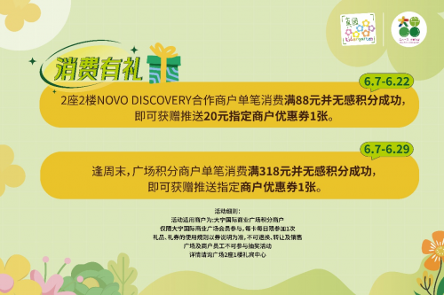 六月裹着阳光翻开了夏日的序章,来大宁国际将生活调至嗨玩模式。6月21日,夏至的第一场热舞派对即兴来袭,连续3小时的音浪碰撞,全体潮男潮女集合,跳舞、唱歌、应援,只要你是KPOP爱好者,这一天必将玩的尽兴,满载而归。每周末,大宁国际为会员们准备了丰富的社群活动,“夏至DIY防蚊包”、“宠物牵引绳”、“插花毛绒花束”、“薄荷海盐手机链”等各类工作坊,为进入闷热的夏日做足清凉准备。即日起-6月29日逢周末,广场积分商户单笔消费满318元并无感积分成功,即可获赠推送指定商户优惠券1张;即日起-6月22日,2座2楼NOVO DISCOVERY合作商户单笔消费满88元并无感积分成功,即可获赠推送20元指定商户优惠券1张(以上活动礼券每日数量有限,赠完即止)。