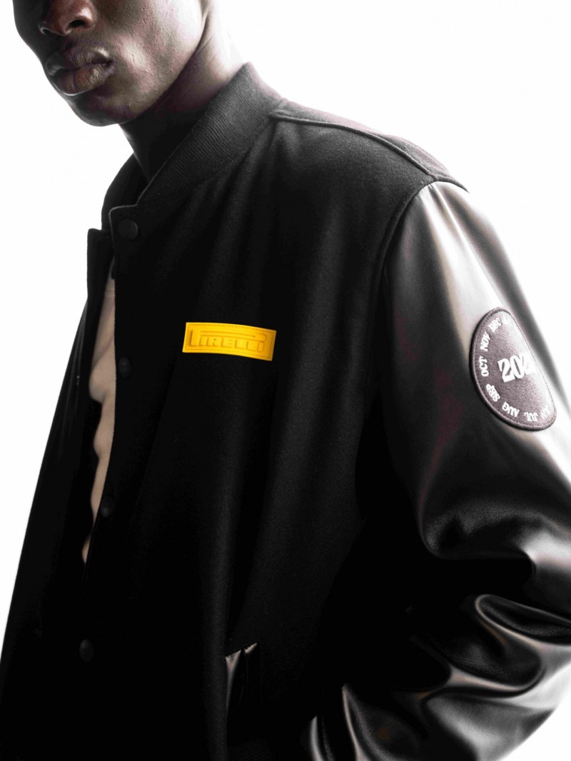流线型轮廓的档案夹克采用优质羊毛与环保皮革高级混纺材质,诠释耐久性与精致感。其极简美学因全黑色调更显突出,并通过刺绣图案与标志性黄色倍耐力logo提升质感。