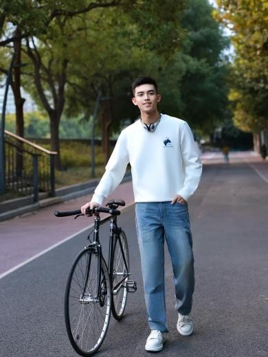 秋日骑行最忌“束缚感”,既要自在追风,又要穿出清爽型格。上身选一件九牧王白色复古玩家卫衣,挺括版型不贴身,告别骑行时的臃肿拖沓;亲肤棉感面料轻盈透气,哪怕秋日阳光仍带暖意,也能保持肌肤干爽。下身搭配同品牌自由牛仔裤2.0,优质新疆棉混纺面料自带呼吸感,透汽不闷汗;立体剪裁+U型档设计堪称“骑行友好”,弯腰、蹬车时毫无束缚,还能悄悄修饰腿型。