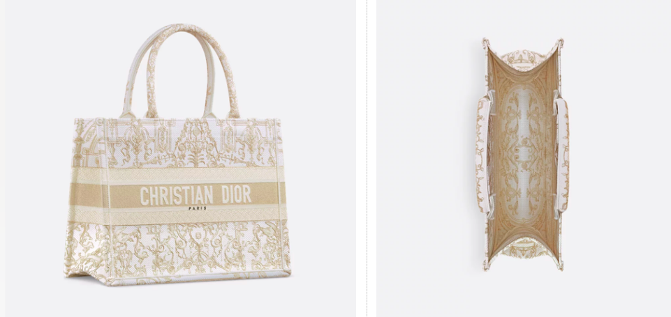 (图注:左:展示圣诞限定款Book Tote整体,金色Dioresque Stella刺绣细节,DIOR徽标点缀,简约设计彰显法式奢华。右:白手提包内壁饰繁复对称金色纹样,皮革细腻,滚边精致,奢华典雅。)