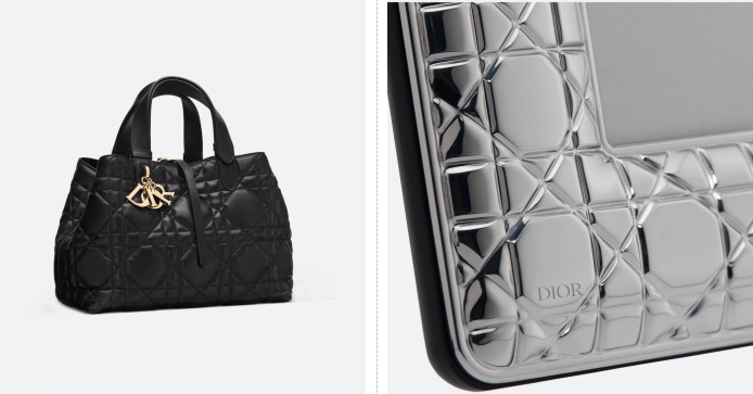 【图1:DIOR藤格纹在时装(手袋)与家居(相框)上的应用对比特写。留空,图注:同一核心符号“藤格纹”,在不同材质(皮革/金属)与品类(手袋/相框)间迁移,完成品牌价值的无缝渗透与场景占领。】