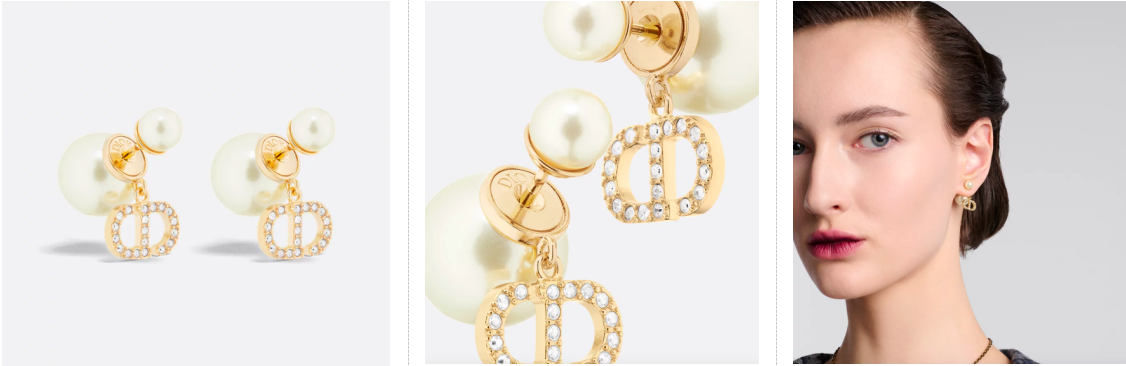 (图注:左:DIOR Tribales耳环整体展示,主珠与CD徽标镶嵌钻石,点缀小珍珠,设计奢华典雅。中:DIOR Tribales耳环细节展示,金色金属镶嵌双C图案耳钉,背面衬以温润米白珍珠,璀璨晶钻环绕。右:DIOR Tribales耳环佩戴展示,尽显优雅内敛。)