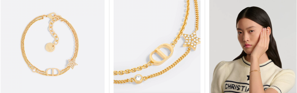 (图注:左:DIOR Petit CD双链条手链整体展示,金色扭纹链条手链,缀CD字母与镶钻五角星吊坠,龙虾扣设计简洁奢华。中:DIOR Petit CD双链条手链细节展示,金色链条手链交织CD吊坠与密镶钻石星芒,于特写光影间尽显精湛工艺与奢华质感。右:DIOR Petit CD双链条手链佩戴展示,腕间金色手链闪耀细腻光芒,诠释静雅奢华。)