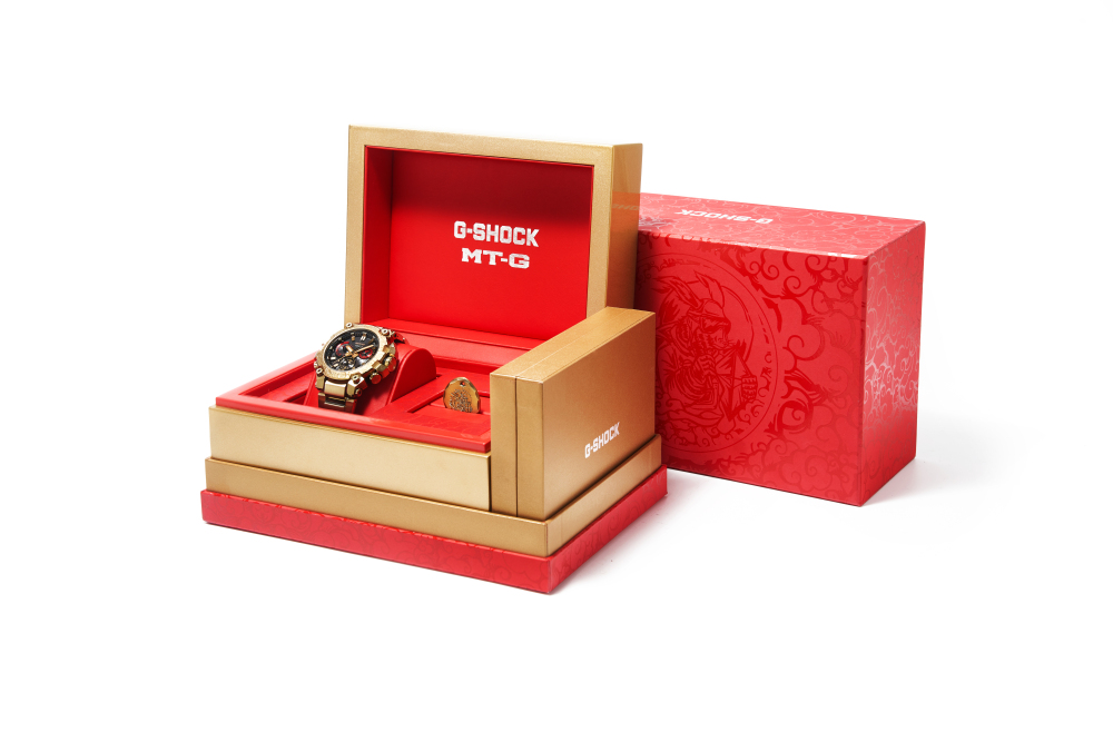 奢感金色在新年之际更添美好祈愿,将不凡融入日常。G-SHOCK MT-G兔年生肖款以金色IP涂层覆盖腕表表圈、表壳及表带,呈现不断精进的至臻工艺与坚韧精神,以高品质感为硬朗造型注入隽永格调。此外,腕表的两个小表盘还特别采用了红色,代表着月兔的红眼睛。在黑与金的映衬下,解锁灵动魅力。